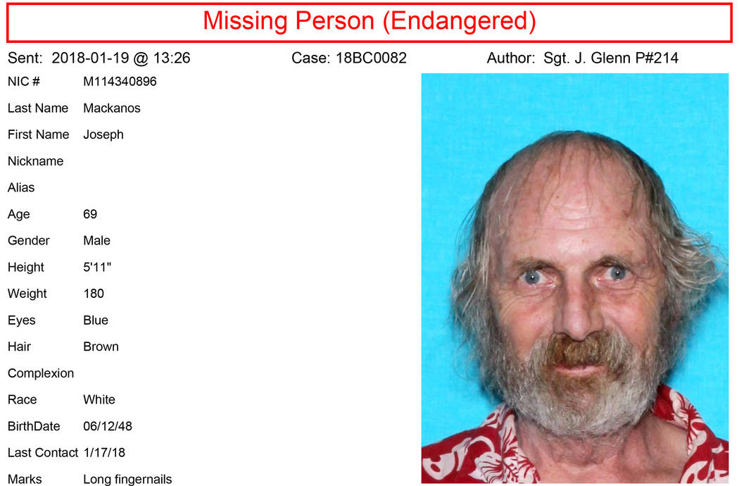 Joseph Mackanos, last seen in Boulder City at about 9 a.m. Jan. 17, is still missing, according to Boulder City Police Chief Tim Shea.