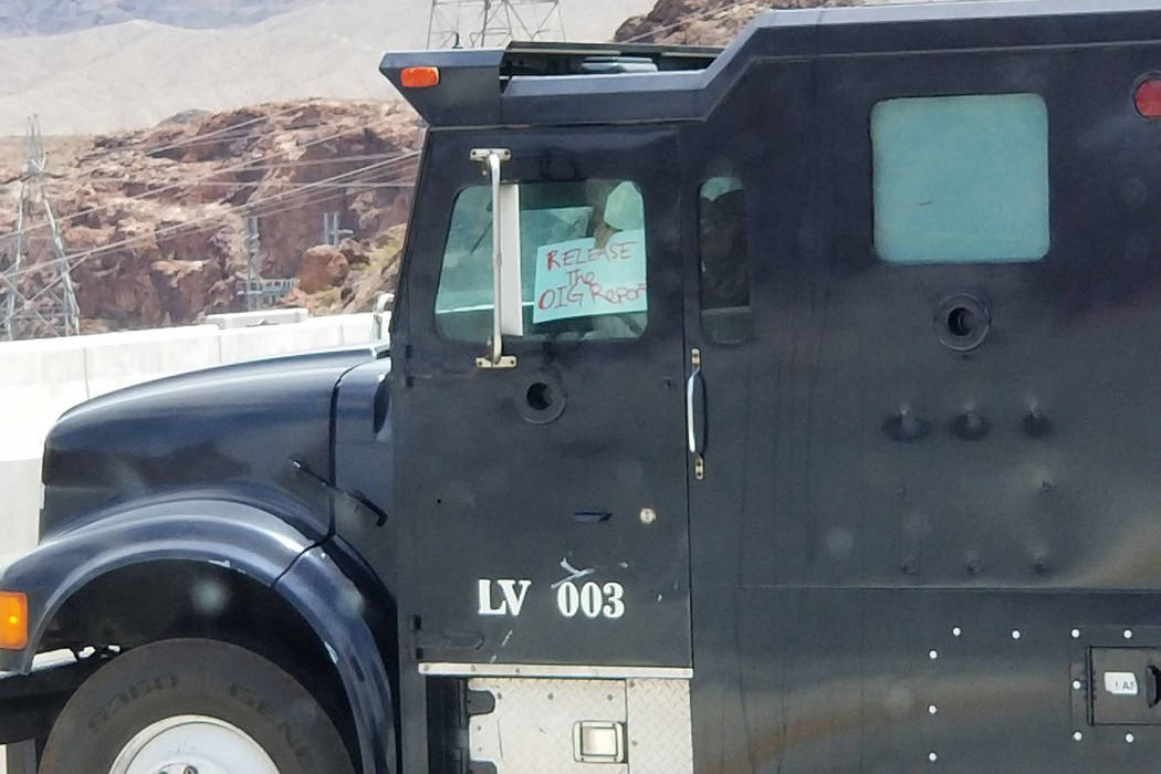 Just before noon on the Mike O’Callaghan-Pat Tillman Bridge authorities allege Wright stopped traffic after parking a black, homemade armored vehicle on the bridge, with a small sign visible from the driver’s side window. The sign, done in red ink, read “Release the OIG report.”