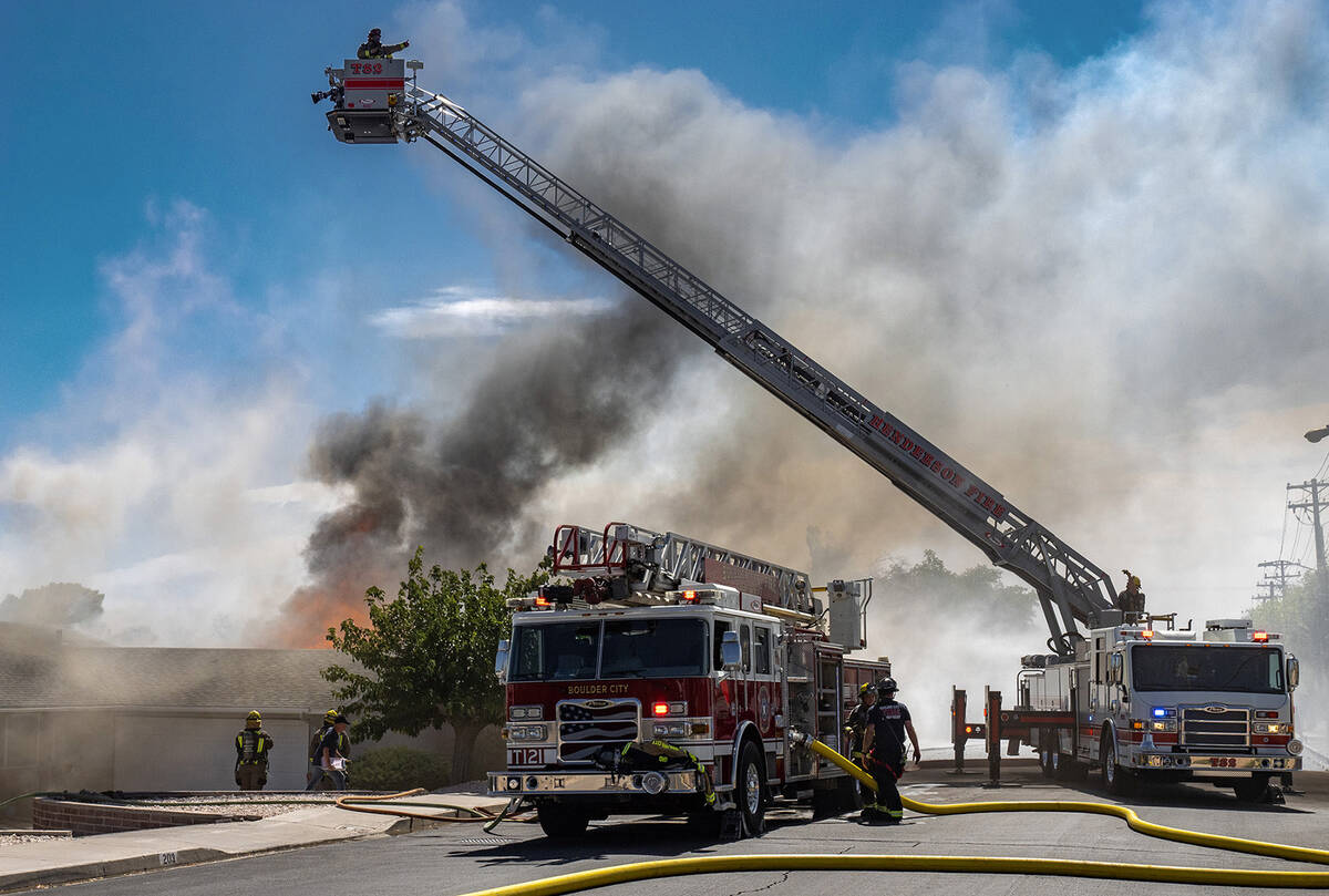 “The power pole caught on fire as a result of the fire,” said Fire Chief Will Gray. “We already had Boulder City Utilities linemen on scene when the power pole burned through, fell to the ground and the transformer exploded.”