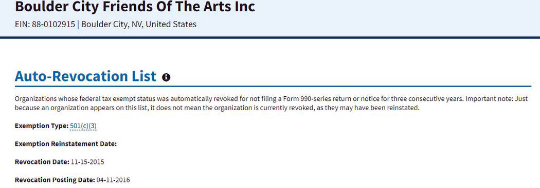 Despite marketing itself as a nonprofit organization, the Boulder City History & Arts Foundation is operating under a 501(c)3 status that was revoked by the IRS in 2015.