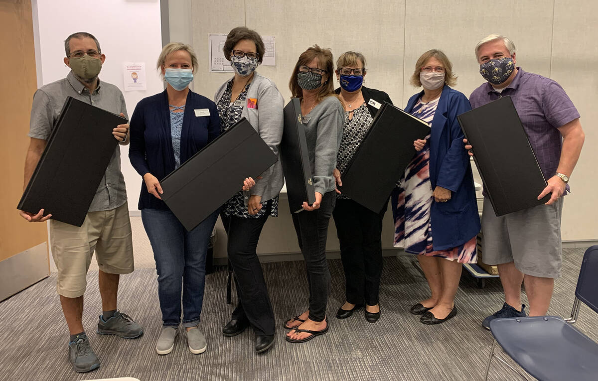 On Wednesday, Oct. 20, Boulder City Library Board of Trustees and staff, from left, James Knowles, Rachel Hunt, director Kim Diehm, Jill Sweet, Andrea Dempsey and Jeff Breeden, far right, accepted a donation of bound copies of the Boulder City Review from Valerie Olsen, second from right, who handles display advertising and subscriptions for the paper. The past editions are available to the public to view or use for research.