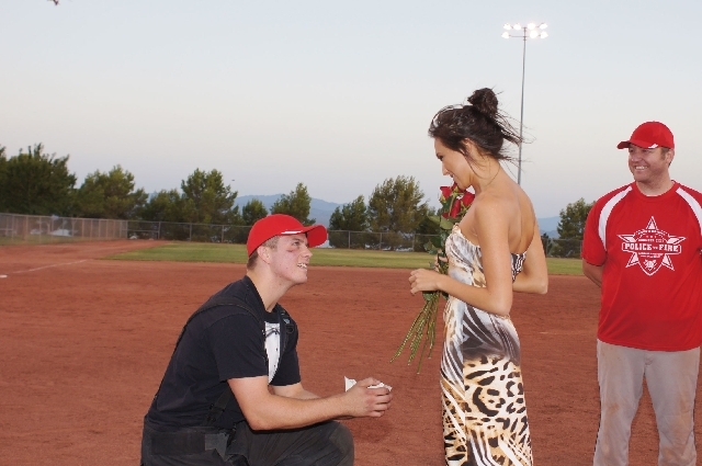 The evening took a turn for the romantic, when firefighter/paramedic Mark McGovern proposed to his longtime girlfriend, Maria Garciabarna, on the field immediately after the game. In true fashion, and with a little help from the rest of the guys, firefighter McGovern got down on one knee and popped the big question in front of everyone.