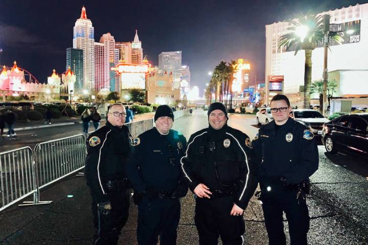 Several Boulder City Police officers joined thousands of officers from other agencies to help protect people who celebrated New Year’s Eve on the Strip.