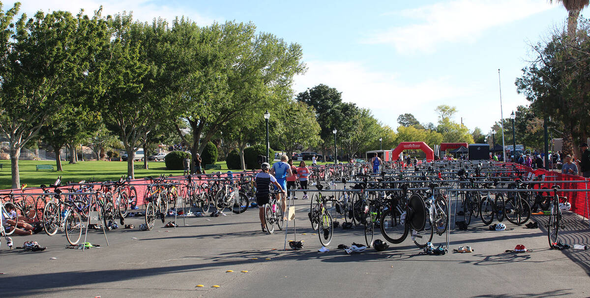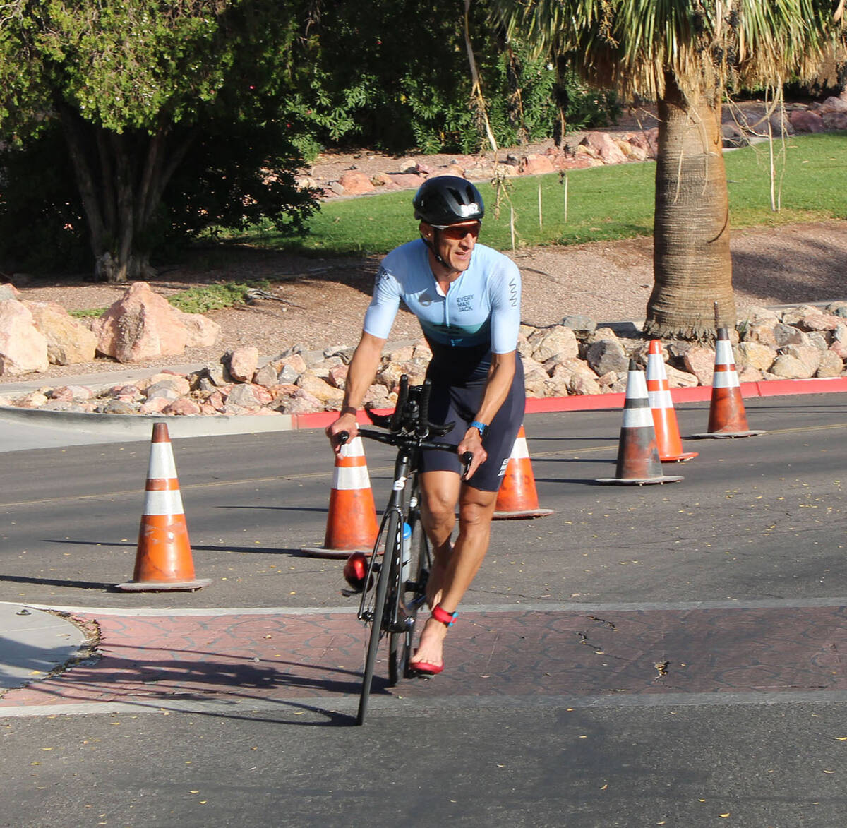 Grullan Luigi prepares to dismount from his bike before the run portion of the sprint triathlon, which he would win.