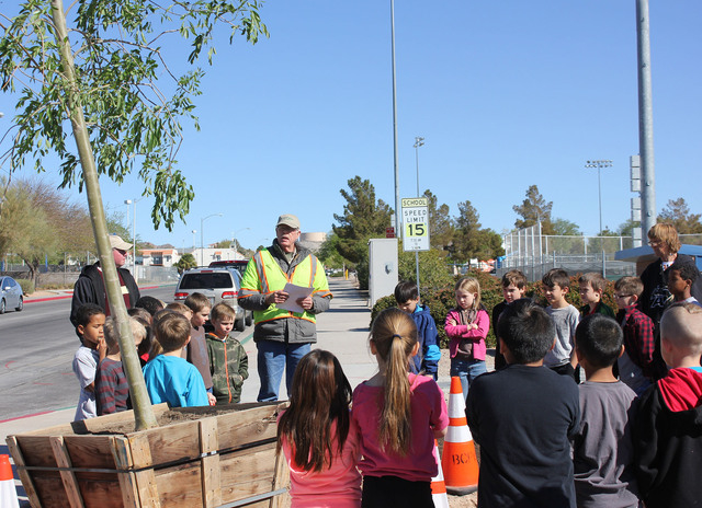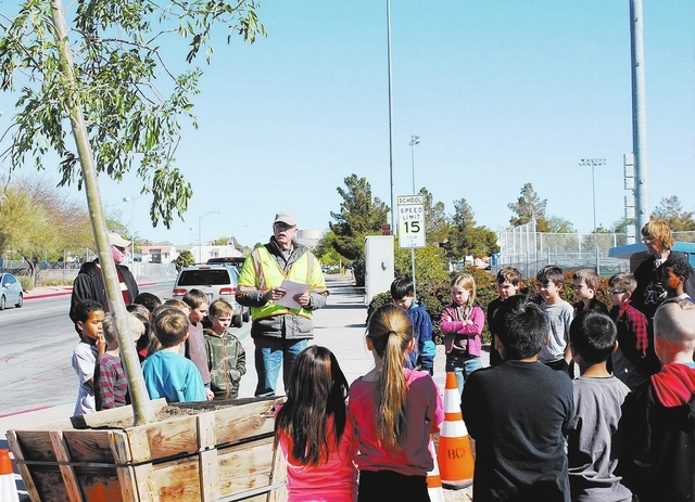 In honor of Arbor Day, celebrated in Nevada at the end of April, the Boulder City Public Works Department planted a Raywood ash near Whalen Field on Avenue B. It was assisted by Rhonda Gatlin’s second-grade class from Mitchell Elementary and Sara Carroll’s third-grade class from King Elementary. Roger Hall, Park & Recreation director, began the ceremony and David Duncan, in yellow vest, an irrigation technician for the city, gave an informative presentation. The students discussed topics such as why trees are important. The tree was planted early to give it a better chance of survival before temperatures soar.