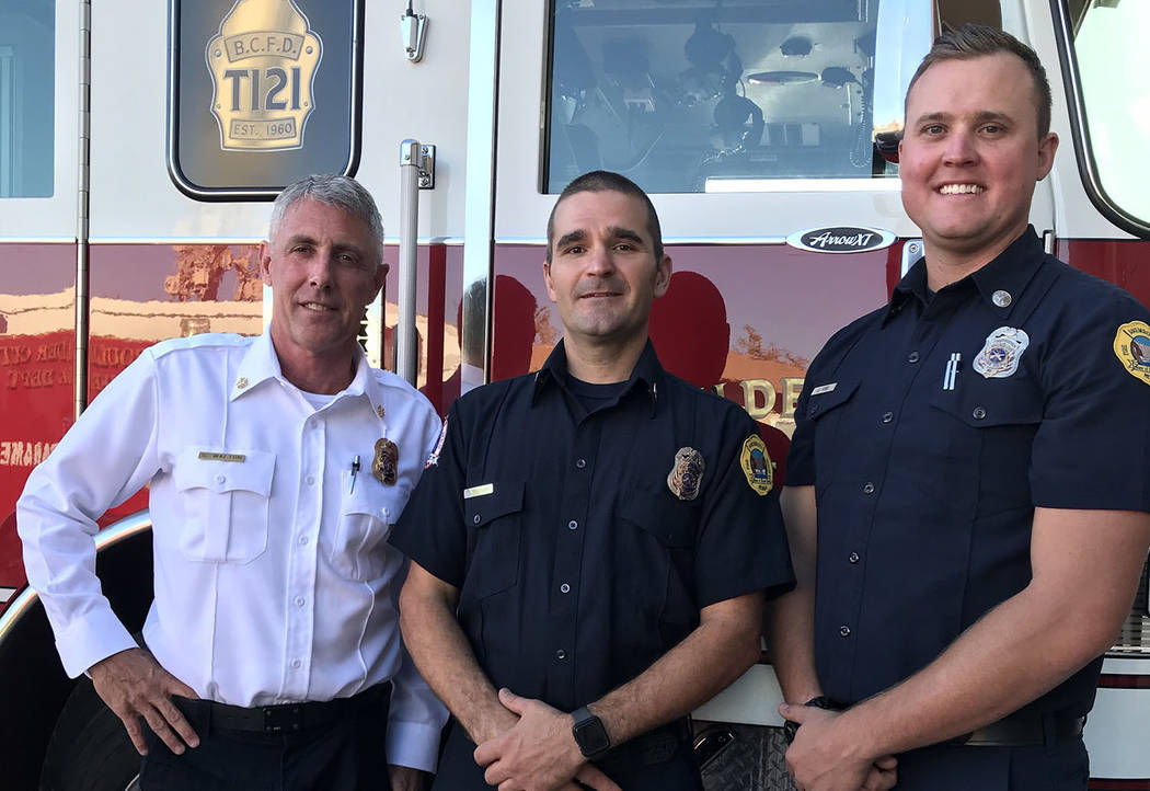 Boulder City Fire Department interim Chief Steve Walton, left, welcomed Jason Dardano, center, and Carl Ford into the department as full-time firefighters during a pinning ceremony Tuesday, Oct. 15. Firefighter Ryan Bodily was unable to attend the ceremony as he was out on a call. The three will take their official oaths during a swearing-in ceremony Tuesday, Oct. 22, during the City Council meeting.