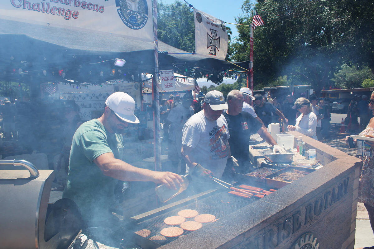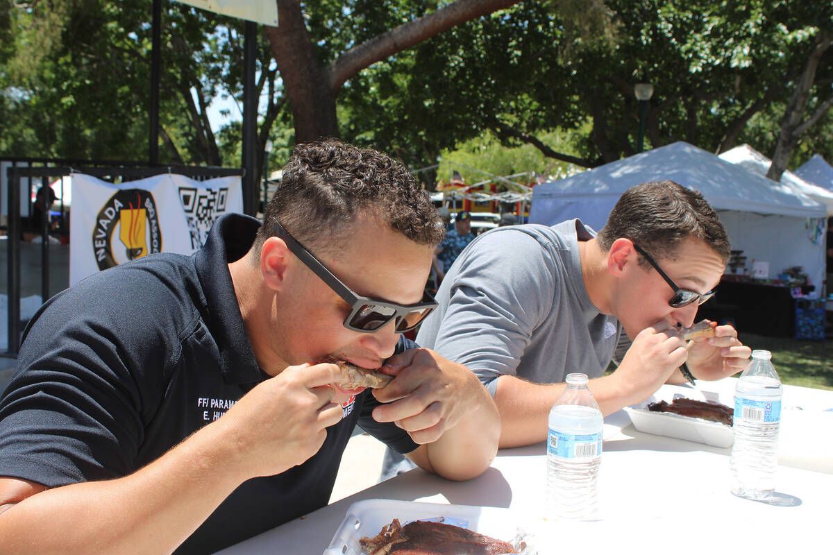 BCFD firefighters Elijah Hubbard and Dominic Mirjanian competed against one another in a rib-eating contest on Saturday during the annual Best Dam Barbecue Challenge. The annual event is hosted by the Rotary Club of Boulder City as well as many sponsors.