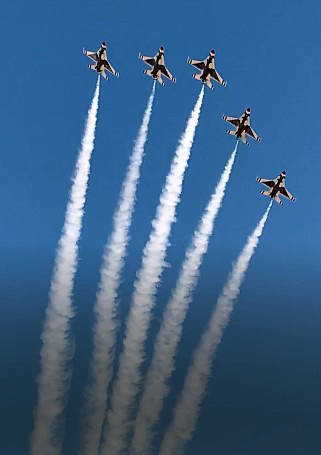 The Air Force Thunderbirds sent a formation that featured F-16 Fighting Falcons across Clark County, including above Boulder City Hospital and the Southern Nevada State Veterans Home, on Saturday to pay tribute to health care workers, first responders and other essential personnel on the front line battling the coronavirus.