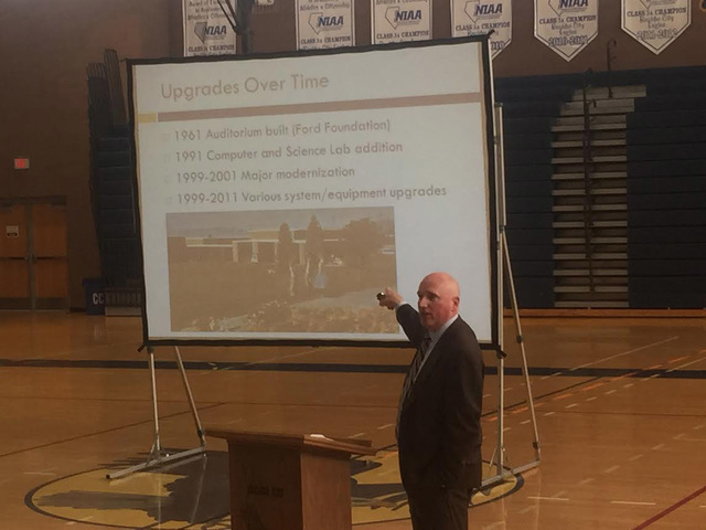 Clark County School District officials and other representatives gave an hourlong presentation to a few parents and community members inside the school’s gymnasium May 6 to discuss the progress of the new Boulder City High School.