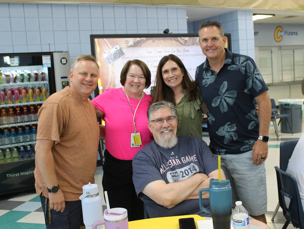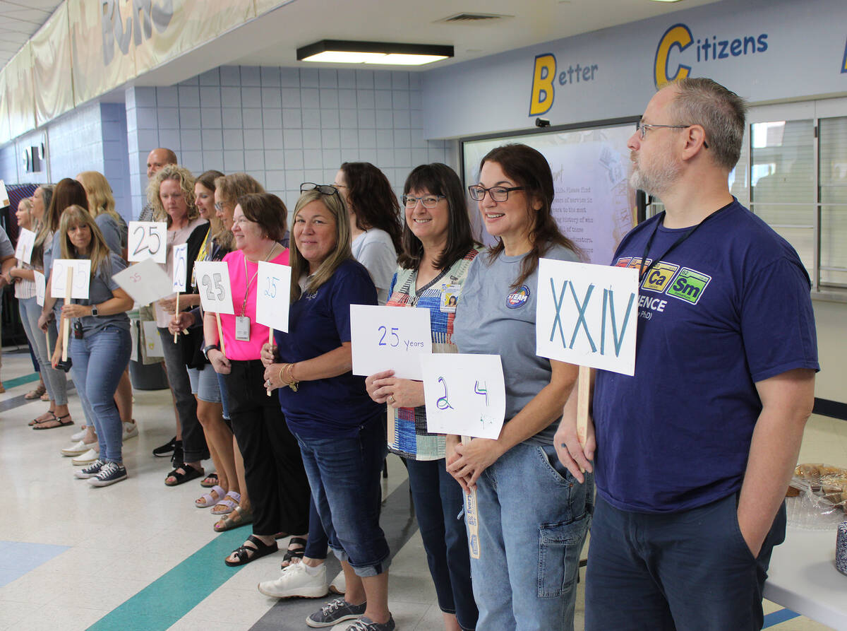 After finishing the legacy sticks, they lined up, shoulder to shoulder, within the interior of the cafeteria in order of the number of years in education. BCHS math teacher Bill Strachan was at one end with 42 ½ years all the way to those just starting in education.