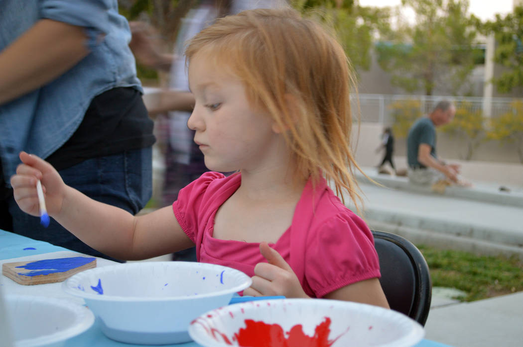 Four-year-old Amelia Solberg paints a wooden Nevada plaque at Friday’s benefit concert at the library. Ruben’s Wood Craft and Toys donated the plaques.