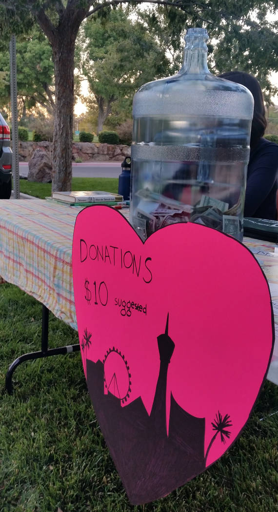 The donation jug at Friday’s benefit concert at the Boulder City Library for victims of the Route 91 Harvest festival shooting in Las Vegas and their families fills up as the show begins.