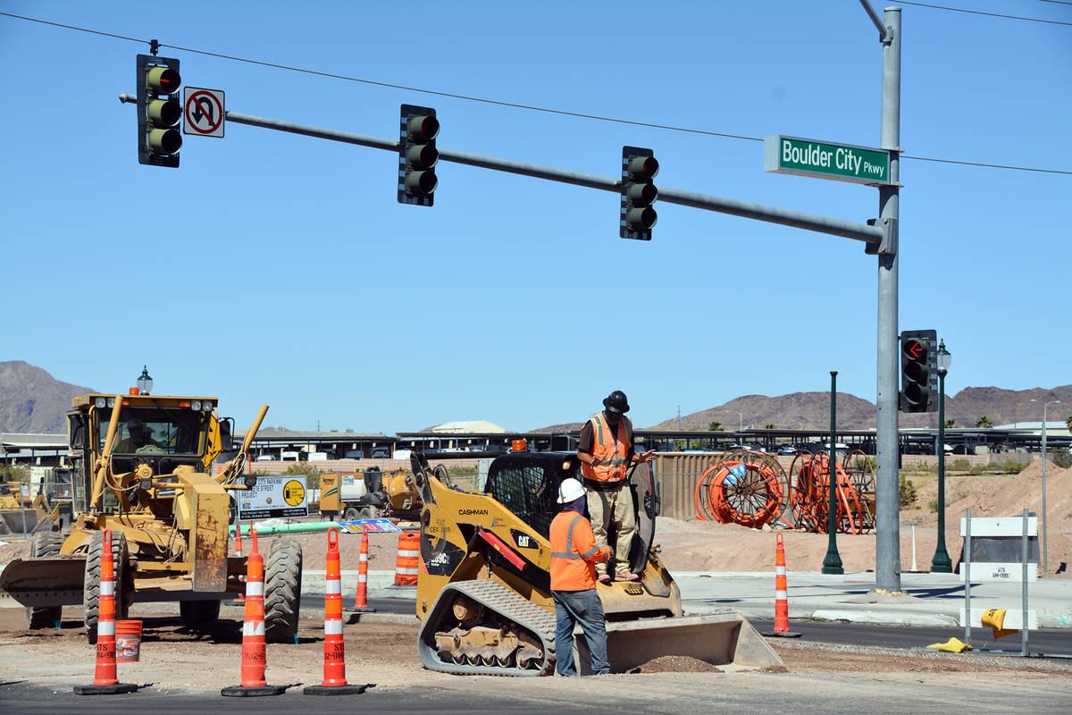 William Charles Construction workers repave the intersection at Boulder City Parkway, Buchanan Boulevard and U.S. Highway 93 on Tuesday, May 5, 2020.