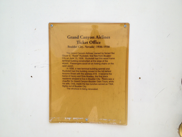 First used as a ticket office for aviator Glover “Roxy” Ruckstell’s Grand Canyon Airlines at the old Boulder City Airport in the mid-1930s, the shack was moved to the top of Arizona Street in 1938.