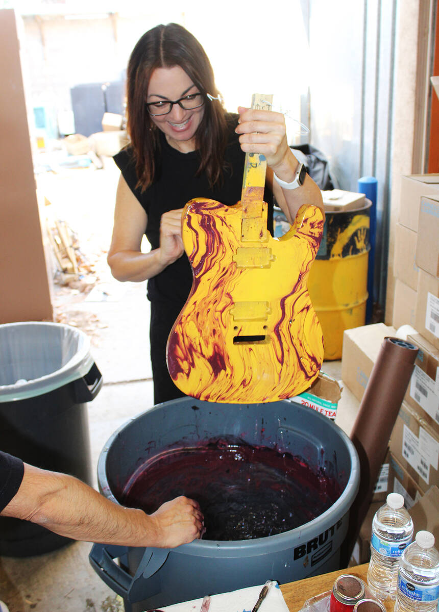 Monday was one of the most popular days of the course – painting. A large, plastic garbage can was filled with water and then, based upon each student’s request, Archuleta would drip colored paint in and mix it gently. Then, the student would lower the guitar into the can, turn it slightly and remove it.