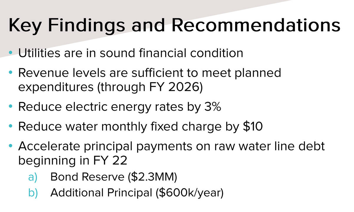 According to its report, Raftelis is recommending the city reduce electricity rates by 3 percent for all customers, reduce the fixed monthly charge for water by $10 and accelerate payments on the debt for the raw waterline.