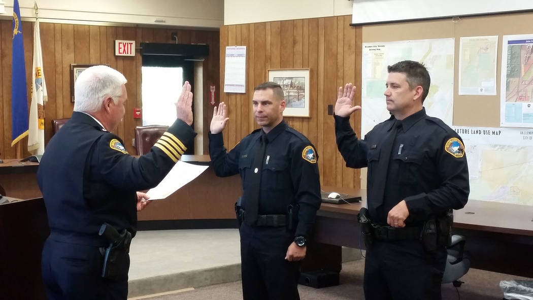 Boulder City Police Chief Tim Shea, left, swears in Boulder City’s two newest police officers, Mike Petty, center, and Bret Hood, during a ceremony Monday at City Hall.