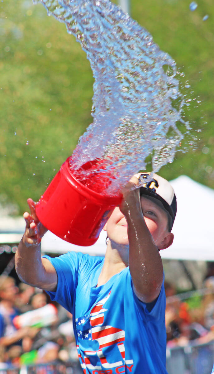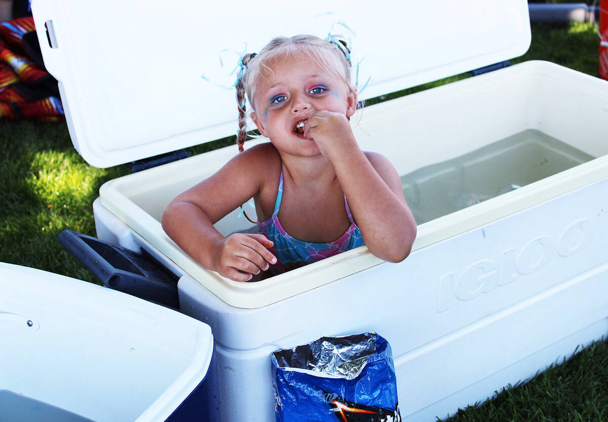 Three-year-old Joanne Wilson, of Boulder City, found the perfect way to beat the heat and have a snack at the same time in Broadbent Park.