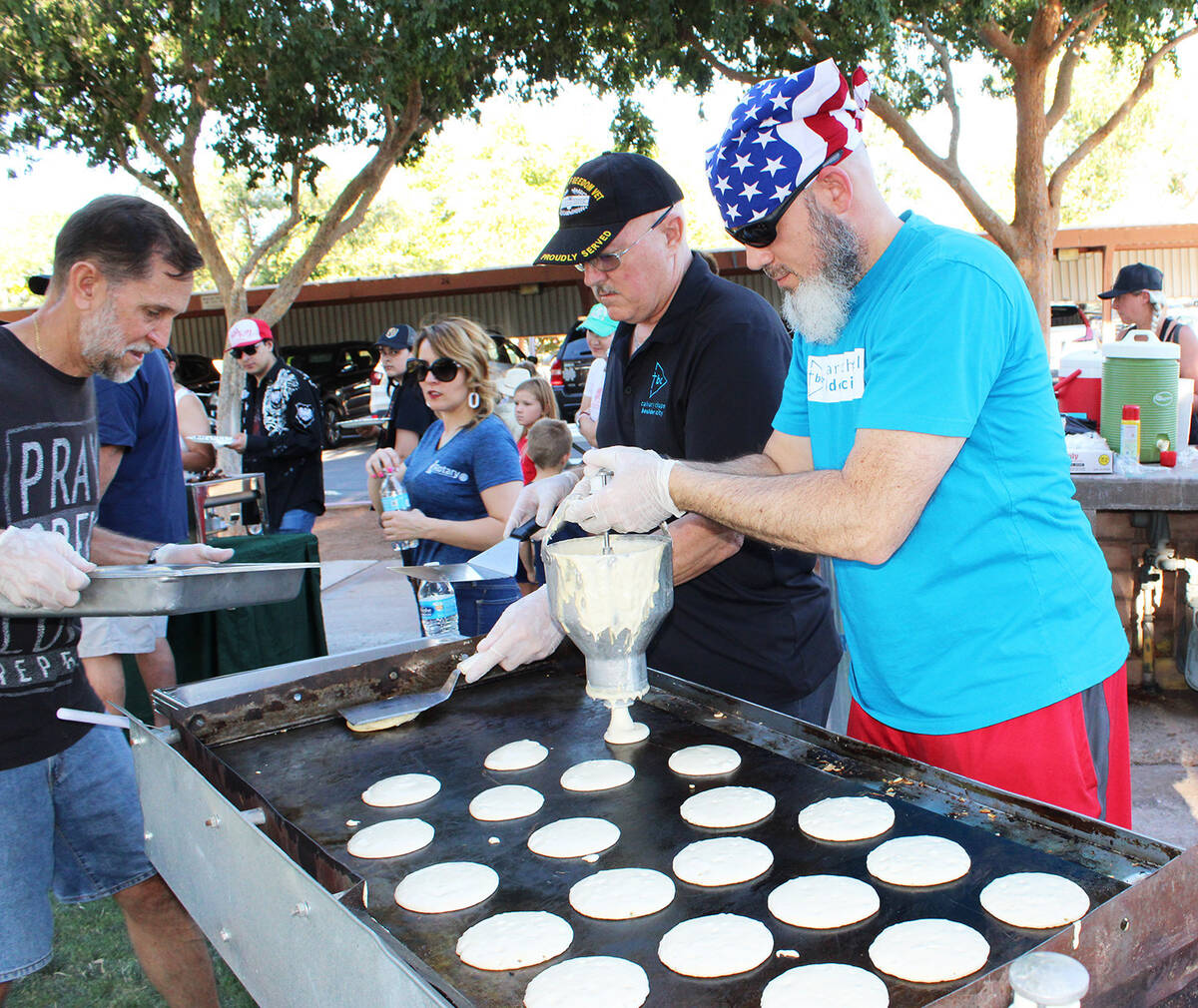 The Rotary Club of Boulder City’s annual pancake breakfast draws an estimated 600 to 800 people. Here, Jason King puts the pancake batter on the grill.