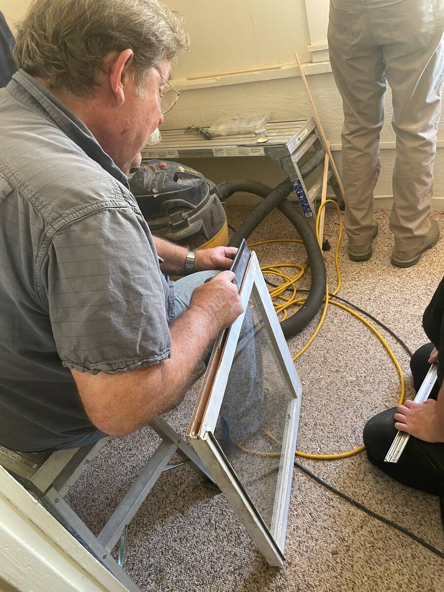 By the final day, Sunday, the heat had taken a toll and everyone was moving a bit slower. Yapp sat directing, offering direction and reminding students of things they had already learned. When the sash was ready to be reinstalled, he got up, grabbed a power drill and a nail gun. He showed them how to nail in the new channel sheath and drilled the holes for the sash pins.