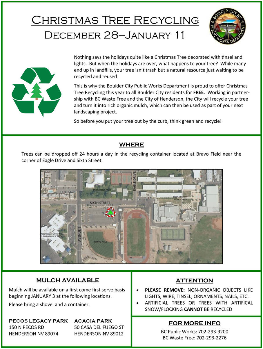 Trees can be dropped off 24/7 in the recycling container at Bravo Field near the corner of Eagle Drive and Sixth Street. The Boulder City recycling program is part of an effort to keep trees out of landfills in Southern Nevada and is done in partnership with Henderson.