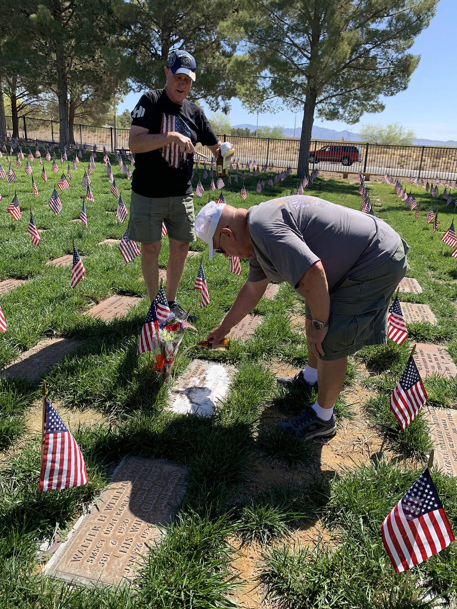 Prior to Sunday’s ceremony, Navy veterans Mick McLean and Al Slagle of Las Vegas came to the cemetery to honor those they served and worked with in the Philippines. Calling themselves the last two of the “dirty dozen,” the men placed flowers at the gravesites and poured Philippine beer on the headstones of two friends.