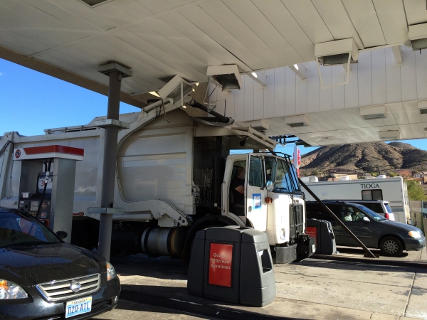 A trash truck crashed into the canopy over the gas pumps at Boulder Stop on Ville Drive Monday morning, destroying several light fixtures. The truck was stuck there for several hours because of mechanical failures. Employee Scott Macrina said the driver didn’t realize he had hit the top until another customer stopped him. This is the second time in less than a year that the driver of a tall truck has damaged the structure, said owner Zee Yousis.