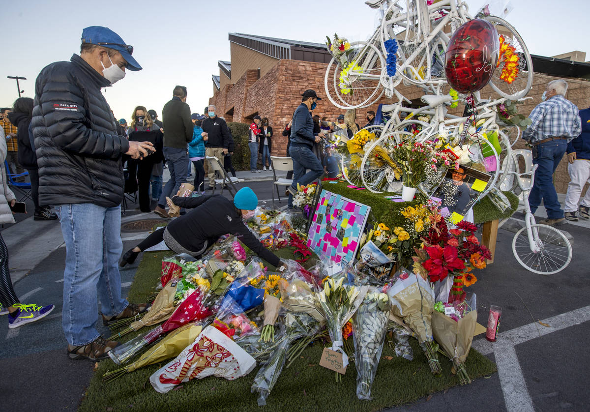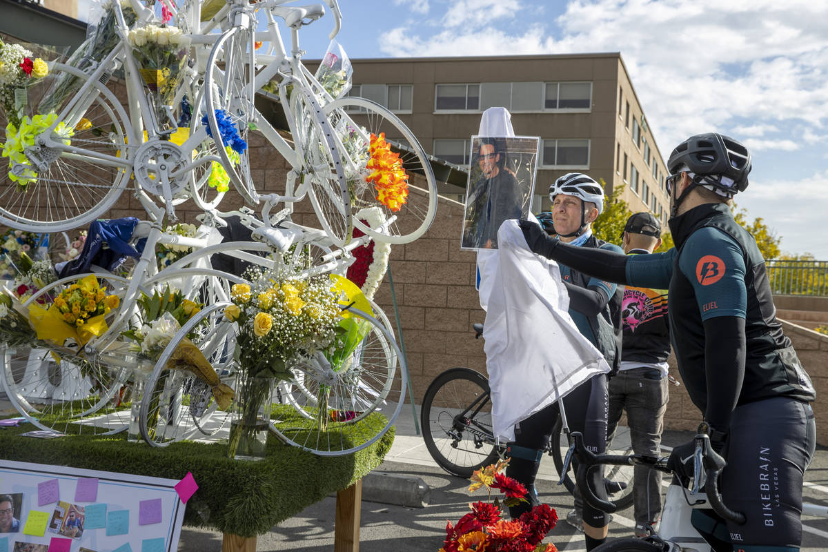 Pictures and dozens of flower bouquets were arranged around a statue from the Ghost Bikes volunteer group, which is kept at the Las Vegas Cyclery bicycle shop. The group promotes bicyclist safety and honors cyclists killed in crashes by placing an all-white “ghost bike” at scenes.