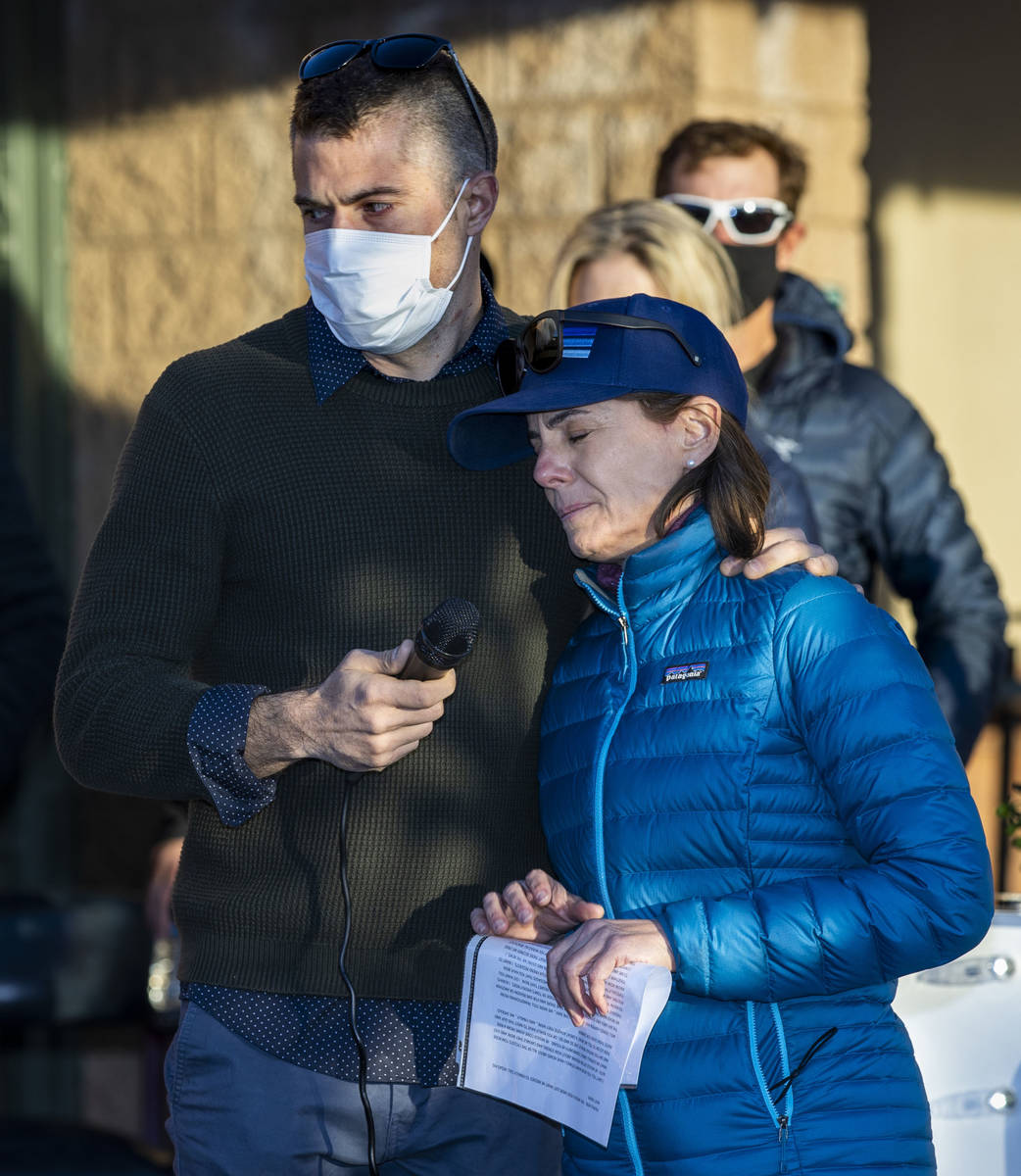 Many of those who walked up to the memorial were overcome with emotion as they knelt before the statue, placed flowers and wrote messages to the five killed. Ahmet’s wife, Angela, and their 17-year-old daughter stood next to the speakers who addressed the crowd. The two wore face masks and cried as friends spoke of their losses.