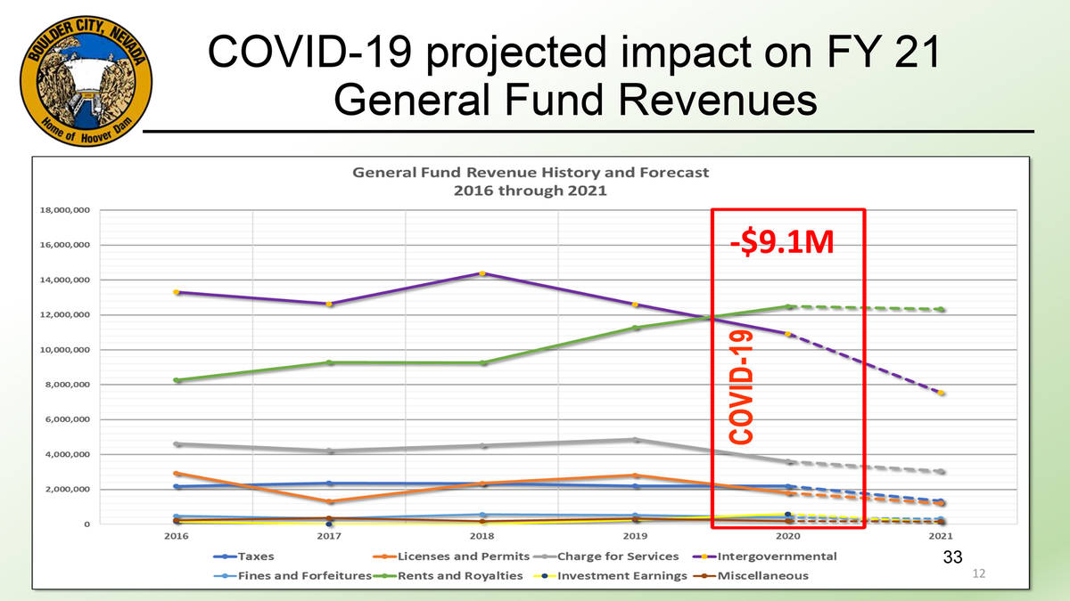 Boulder City is facing an estimated $9.1 million revenue loss for the 2021 fiscal year budget because of the COVID-19 pandemic and staff is suggesting to use almost $4 million from reserves to help balance and offset those losses.