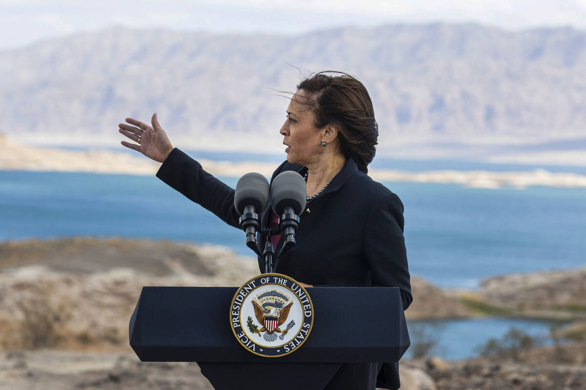 Vice President Kamala Harris made the climate change case for two Biden administration initiatives Monday, Oct. 18, with the declining water levels of Lake Mead as a backdrop.