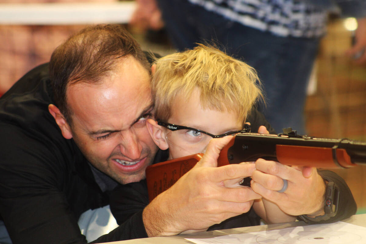 Marshall Hill, above, gives his 5-year-old son Tanner a hand during Monday’s annual Turkey Shoot hosted by the Boulder City Parks and Recreation Department. Children and adults paid to shoot BB guns at a target with prizes later awarded.
