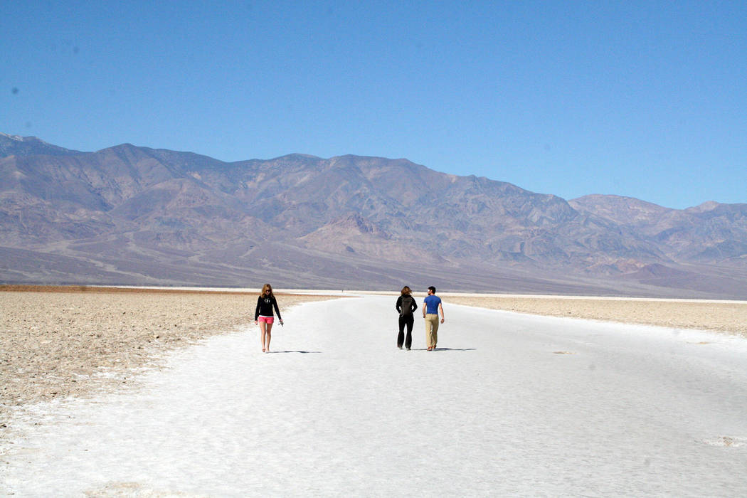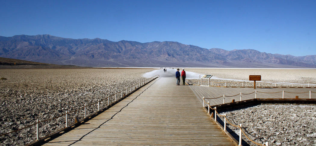 From the parking area at Badwater Basin, head out on the wood boardwalk and then down onto the salt pan itself. The path, leveled by visitors’ footsteps, is flat and looks like packed-down snow.