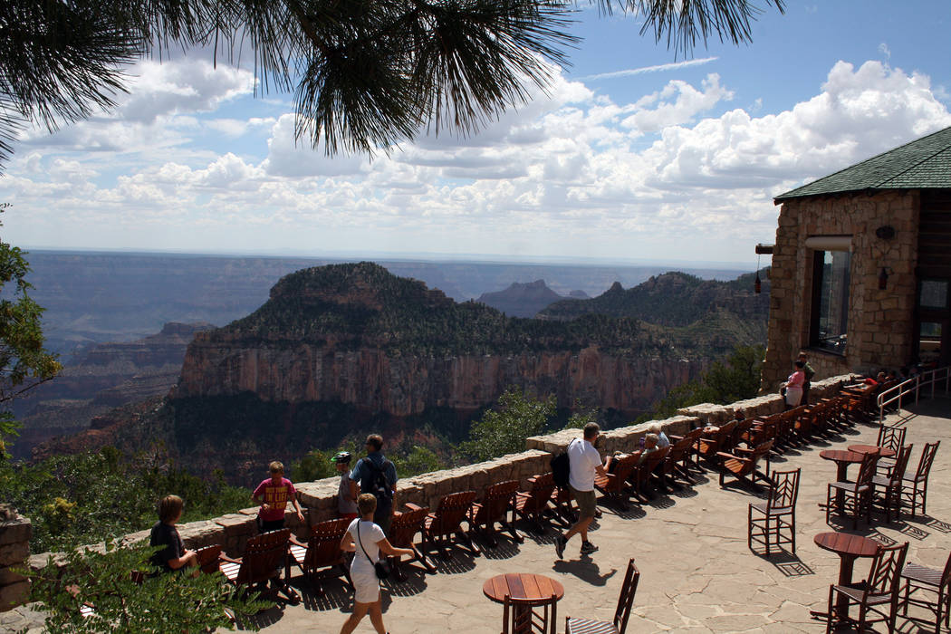 The hub of the park is the Grand Canyon Lodge, located directly on the rim and surrounded by all sorts of services. There are lots of bathrooms, water stations, a ranger-staffed visitor center, gift shops, a bar, post office and a quick-grab deli with sandwiches and pizza. The lodge is Western rustic, but its lodging is pricey. It has cabins of different sizes, all with porches, or located near or directly on the rim. However, any visitor to the park can go to the lodge and take in the views, relax on the living room couches or on the deck and take in a free ranger program.