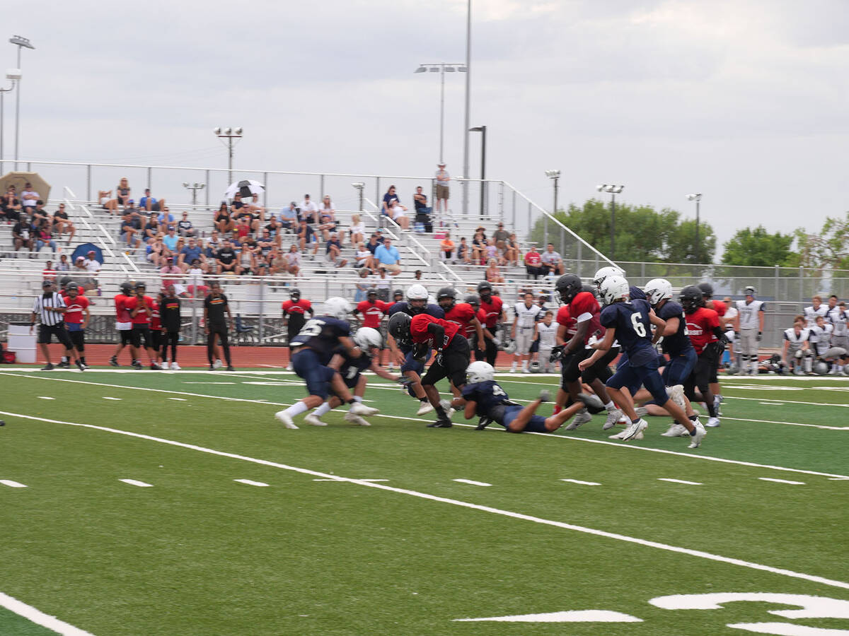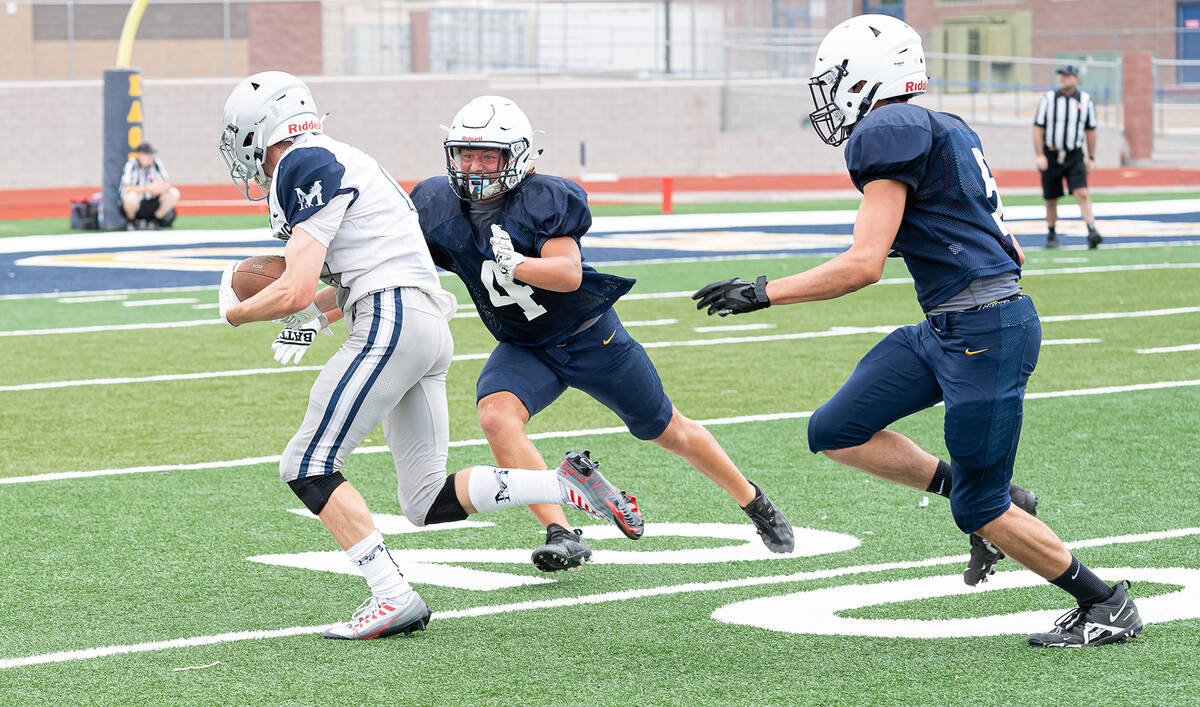 Boulder City High School’s football team is gearing up for the 2022-23 season and took on The Meadows and Somerset Academy Losee on Saturday, Aug. 13, for a scrimmage at home. Varsity and junior varsity split the field as each team took 10-play turns on offense and defense.