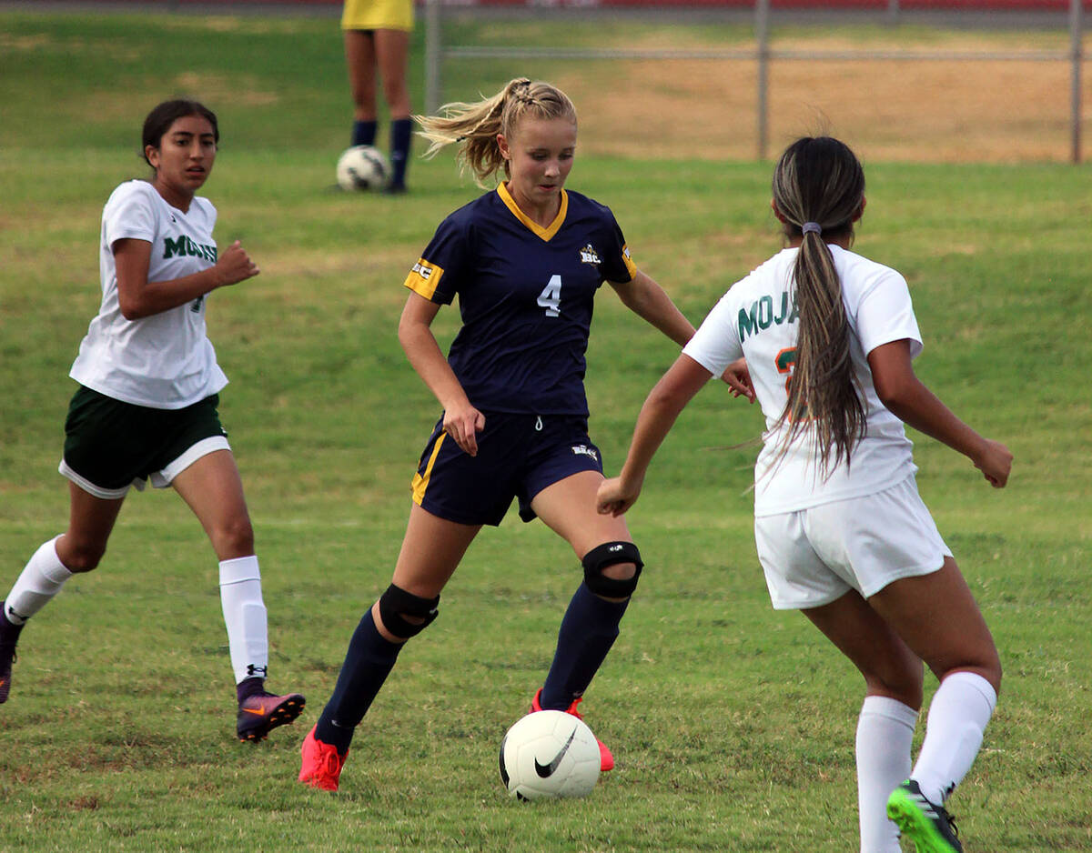 Hanging tough with the top team in the 3A classification, Boulder City High School’s girls soccer team fell to Pahrump Valley 4-2 on Monday, Sept. 20.