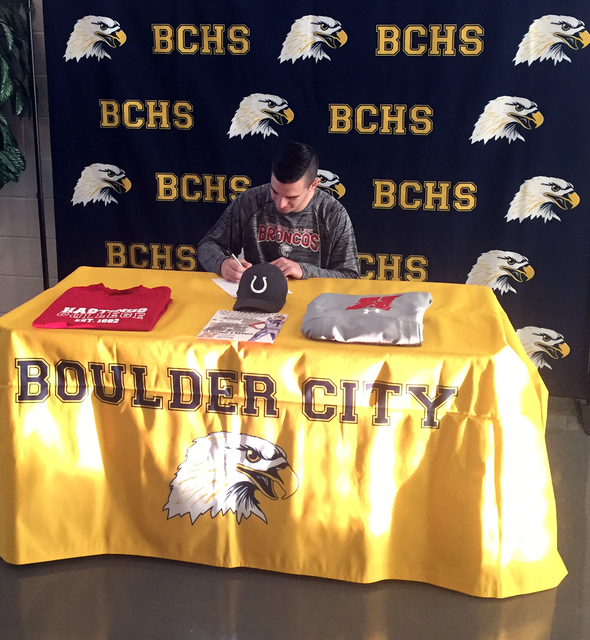 Boulder City High School football player Taylor Hatchel has signed his letter of intent with Hastings College in Hastings, Nebraska, where he’ll play football for the Broncos at the National Association of Intercollegiate Athletics level.