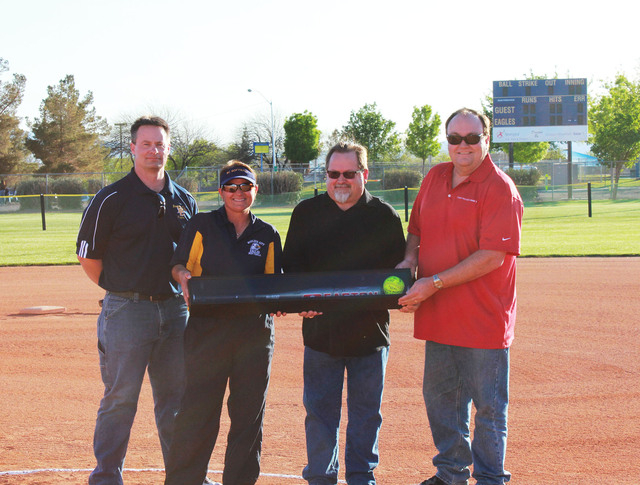 Boulder City High School Principal Kent Roberts, from left, and softball coach Angelica Moorhead presented Brad McKinley and Justin Hawkins, representing Sempra and Copper Mountain Solar, a bat and ball at the Lady Eagles’ home game Friday to thank the companies for the donation of the new scoreboard, which was lit for the first time. “We are so thankful that Sempra and Copper Mountain stepped up to help us and the city by donating this new scoreboard. We’ve needed one for some time and we’re just really happy that they were able to help us get this project done,” Roberts said.