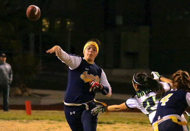 Each week the coaches at Boulder City High School select an athlete to spotlight for contributions made to his or her team. This week’s honoree is junior Jeanne Carmell, quarterback and corner for the flag football team. In three crucial games against Basic, Foothill and Green Valley, all won by the Lady Eagles, Carmell completed 45 of 67 passes for 488 yards and five touchdowns. She also rushed 40 times for 333 yards and one touchdown. Defensively, Carmell added six tackles and four pass deflections. She is the daughter of Scott Carmell.
