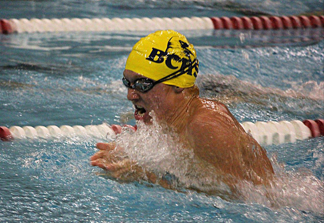 Sauerbrei swam 1:01.19 to edge teammate Jason Lyon, who was second with a 1:04.03, in the 100-yard breaststroke. Nicholas Walker placed fourth in the event in 1:06.35.