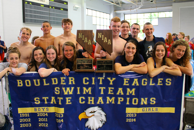 For the fifth consecutive year, the Boulder City boys swim team are Nevada Interscholastic Activities Association Swimming and Diving Division I-A state champions. The girls won their third championship in a row after the competition Saturday in Carson City.