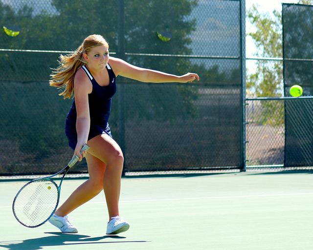 Melissa O’Berto, Arianne Hess and Natalia Fullmer each went 3-0 in singles to lead Boulder City’s girls tennis team to a 15-3 victory over visiting Sunrise Mountain in a league match Sept. 17.