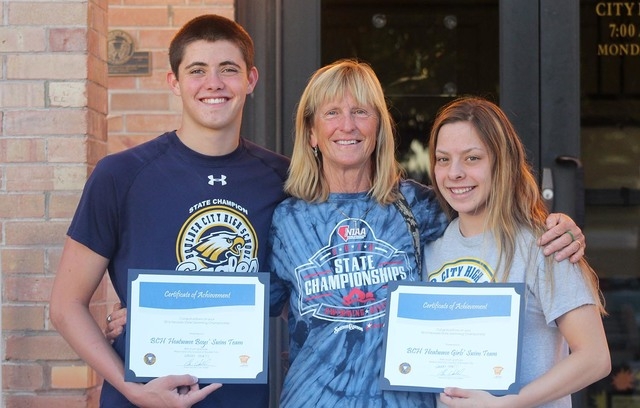 Newly crowned Division I-A state champions, the Boulder City High School’s boys and girls swim programs were honored Tuesday by City Council for their achievements, both collectively and individually.