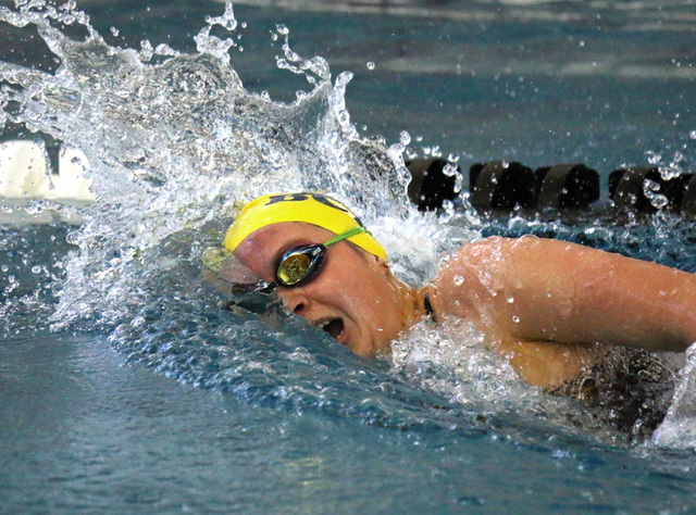 The Lady Eagles’ youth movement led the way for Boulder City, headlined by freshman Rose Pouch sweeping both of her events, placing first in the 50-yard freestyle and 100-yard butterfly with times of 26.4 and 1:00.09, respectively. Freshman Annika Freiburger also displayed her talents in the 200-yard individual medley with a winning time of 2:24.52, while freshman Aimee Garcia placed first in the 100-yard breaststroke with a time of 1:10.30.
