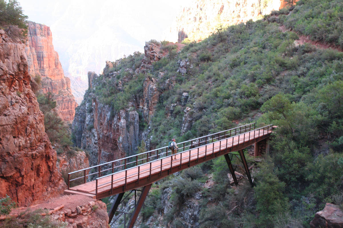 If you are extremely fit and can start at the crack of dawn you might want to hike a short way into the canyon itself via the North Kaibab Trail. All hikes below the rim are very strenuous outings because of the elevation loss and gain on the return. One good destination would be the hike of 4 miles round trip (1,400 feet elevation loss) to Supai Tunnel or the 5.2-mile round trip (2,200 feet elevation loss) to Redwall Bridge. Never attempt to go all the way to the river and back in one day; many have died trying.