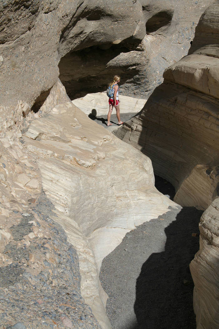 From the trailhead, at about 935 feet, follow the obvious route up the dry stream bed, which soon narrows into a tight little canyon. You will find smooth marble walls of Noonday Dolomite that have been polished by years of debris scouring the walls during flash flooding. Keep an eye out for the Mosaic Canyon Breccia (Italian for fragments), which looks manmade.