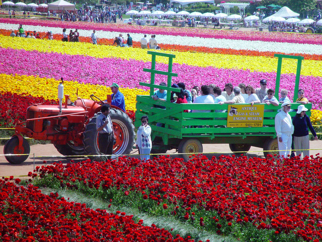 Unique to this area is the Flower Fields at Carlsbad Ranch. In springtime, for more than 60 years, visitors have been enchanted by a solid carpet of real flowers stretching as far as the eye can see. The gardens encompass more than 50 acres overlooking the Pacific, an area so large you can take a tractor ride through the fields.