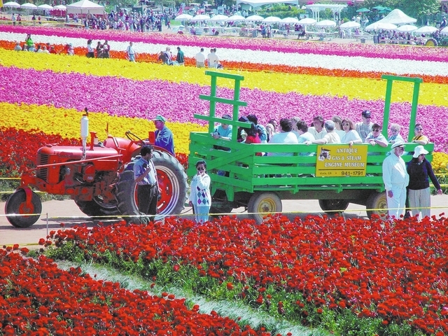The featured flower is the Tecolote giant ranunculus, a member of the buttercup family. Its annual bloom lasts six to eight weeks, peaking in mid-March to mid-April. Other acres are devoted to specialty flowers. The Flower Fields are open seven days a week from 9 a.m. to 6 p.m. through May 11. For further information, visit www.theflowerfields.com or call 760-431-0352.