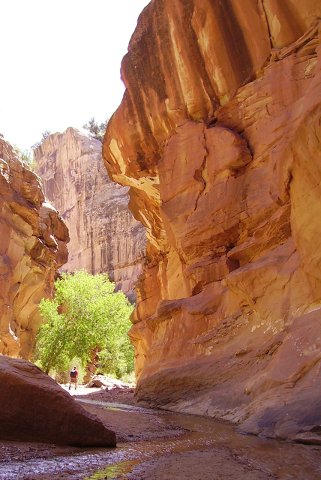 The canyon is especially narrow in the first part of the hike, its walls only about 20 feet apart in some places. Yet these bright orange and red cliffs, of Kayenta and Navajo sandstone, rise some 100 feet high. On the canyon floor grow cottonwoods and box elders, and wildflowers can be found throughout May.