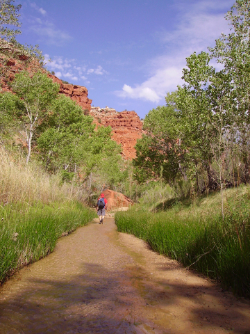 The first quarter-mile of the canyon is usually dry unless there has been a recent rain. Thereafter, for the next 10 miles, you will find water — so much of it that you’ll often be walking in it, a few inches deep on a relatively sandy creek bottom. However, the upper canyon is dry, so backpackers must be sure to carry their own water. You’ll need to treat any water you take from the creek.